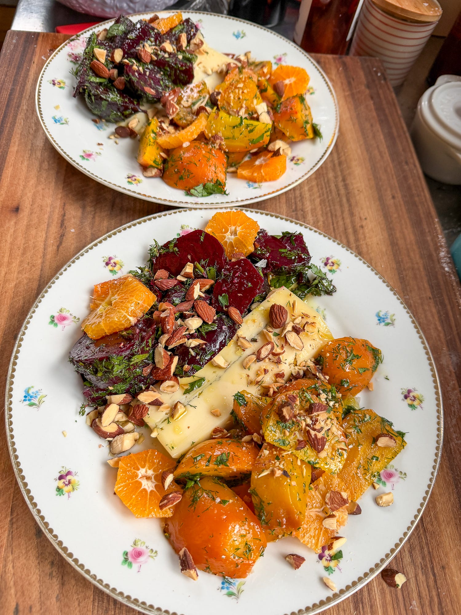 As complex as that looks, it was really just roasted beets, a simple vinaigrette, toasted almonds, some orange segments, chopped parsley and dill, and — the most important ingredient of all — a big wedge of Morbier cheese.