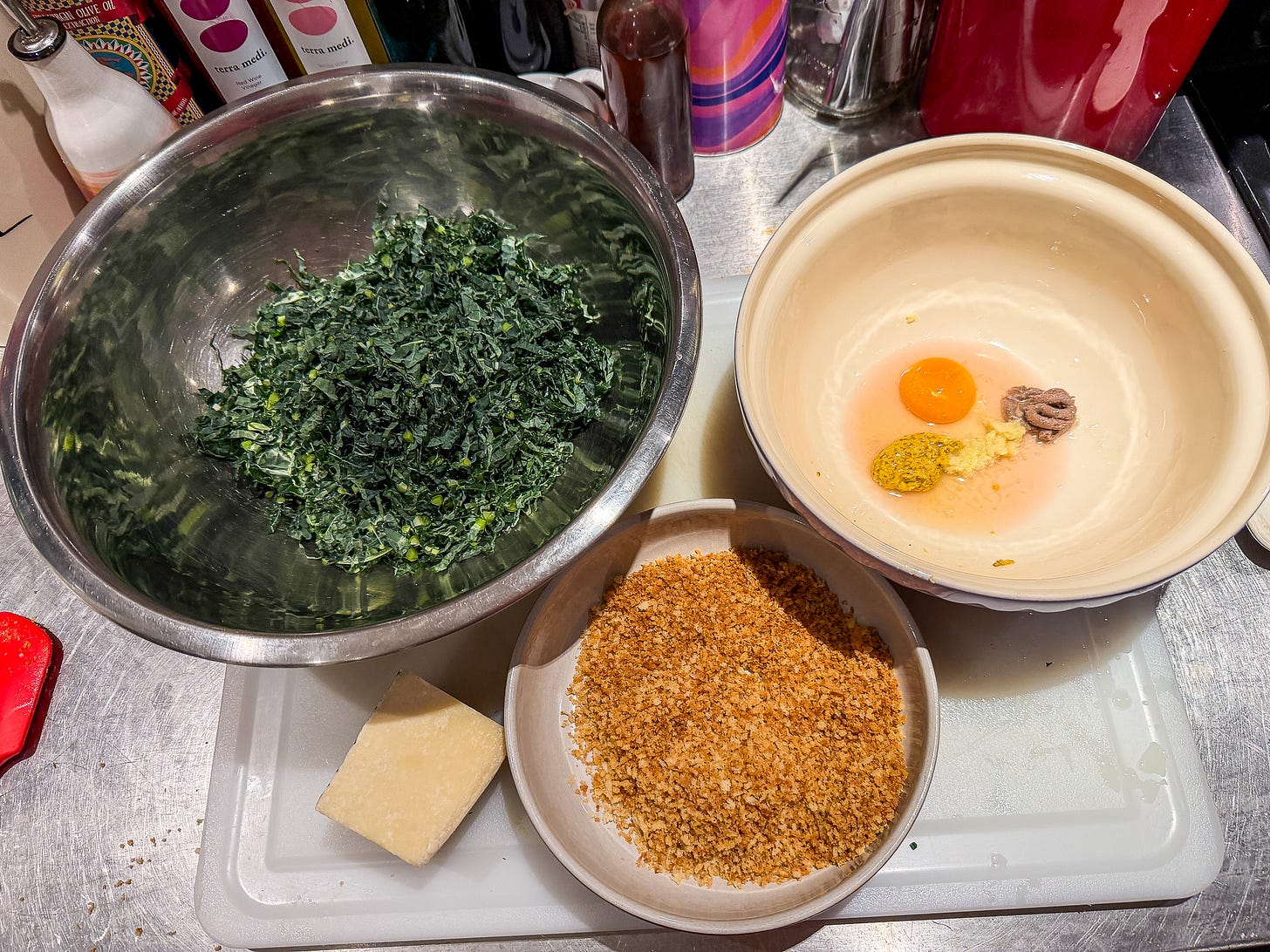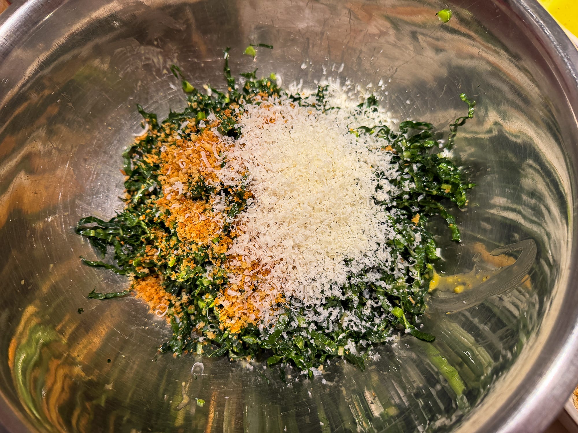 After that you make a punchy dressing with an egg yolk (this is basically a Caesar salad dressing), anchovies (I used anchovy paste), garlic (I grated mine), Dijon, red wine vinegar, and lemon juice emulsified with extra-virgin olive oil. You can see those elements on the right along with the shredded kale, Pecorino (pre-grating), and toasted Panko breadcrumbs (a quick sauté in a skillet with some olive oil and a pinch of salt).