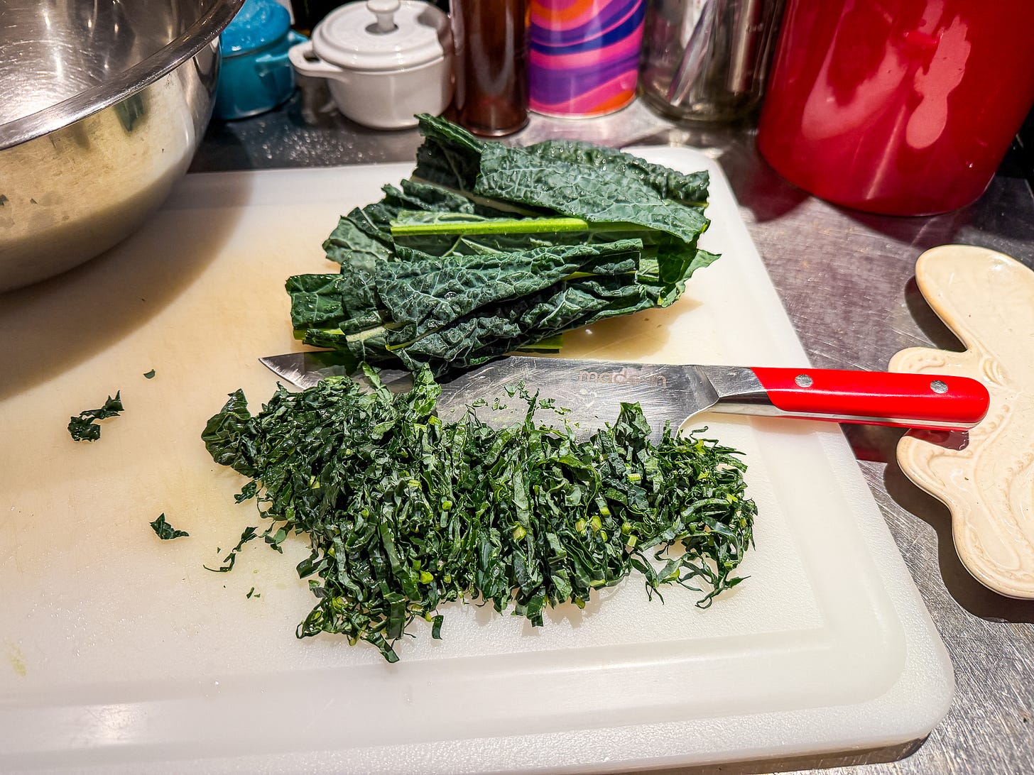 1. Wash the kale well and dry in a salad spinner. With a very sharp knife, julienne the kale as thinly as possible. Place the kale in a salad bowl and keep cold.